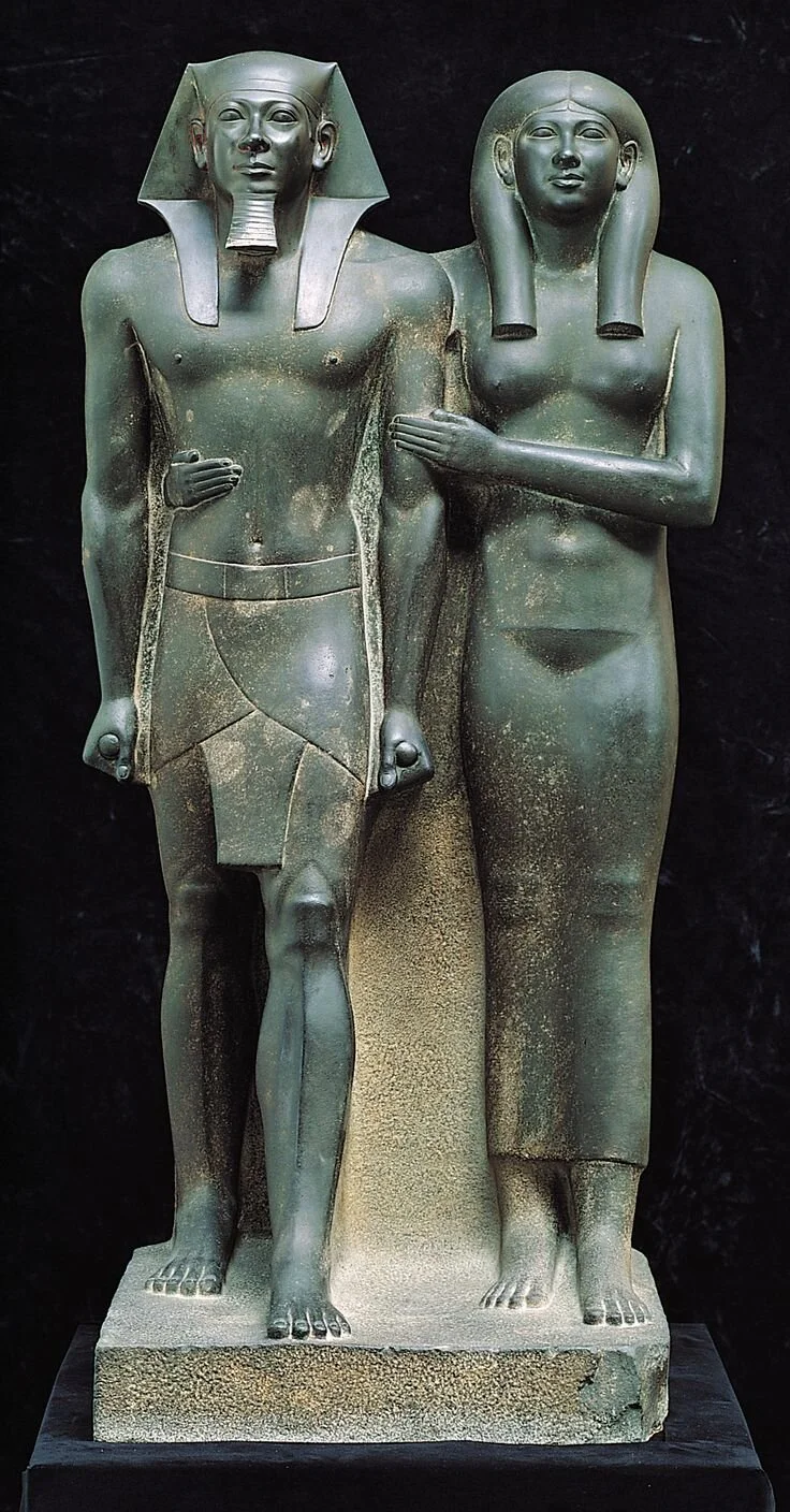 Menkaure’s queen provides the perfect female counterpart to his youthful masculine virility. Sensuously modelled with a beautifully proportioned body emphasized by a clinging garment, she articulates ideal mature feminine beauty. There is a sense of the individual in both faces. Neither Menkaure nor his queen are depicted in the purely idealized manner that was the norm for royal images. Instead, through the overlay of royal formality we see the depiction of a living person filling the role of pharaoh and the personal features of a particular individual in the representation of his queen.