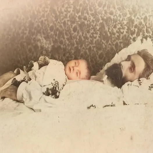 This quiet, heartbreaking photograph (one version carefully colorized) shows a deceased man lying in repose with a small child resting peacefully on his chest. No names. No date. No cause of death recorded. Yet everything about their appearance—their healthy weight, calm expressions, and the tender way they’re arranged—points to a tragedy that struck suddenly and without warning.