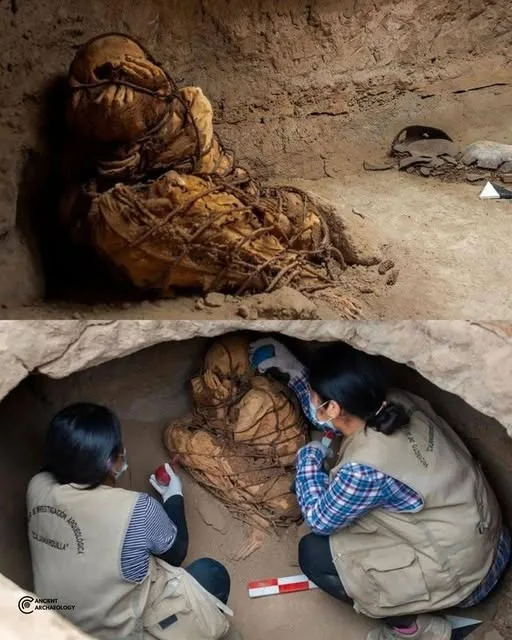 A mummy, fully bound in ropes and with its hands covering its face, has been discovered in an underground tomb in Peru.