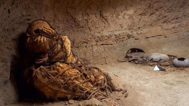 Although the mummy’s striking pose – bound by ropes and in the foetal position – appears chilling at first sight, researchers believe it is a southern Peruvian funeral custom.