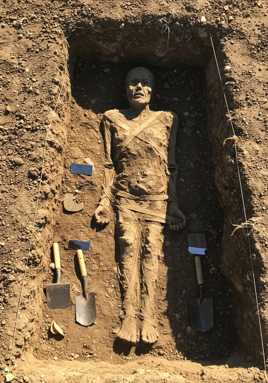 Archaeologists excavating a remote and previously uncharted region have made a discovery that is sending shockwaves through the scientific community — a human mummy so perfectly preserved that experts are struggling to comprehend how it has survived the passage of time virtually untouched. The remains were found buried in isolation, with no tomb, sarcophagus, or accompanying artifacts to explain their presence. The body’s wrappings remain intact, its skin and features astonishingly well-defined — details that would normally erode or decay after centuries, even under ideal conditions. What makes the find even more baffling is the environment itself: the area shows no signs of the dry desert climate typically associated with natural mummification. The mystery deepens as researchers report that the soil composition surrounding the body appears chemically unique, hinting at preservation processes unknown to recorded history.