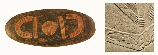 Left: An Australian churinga stone. Right: A closeup of the central pillar in Göbekli Tepe’s Enclosure D with a similar symbol. The pillar depicts a deity, showing this symbol is similarly sacred in the cultures that created both objects.