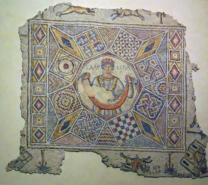 Many mosaic floors were excavated in the ruins of the Roman/Byzantine city. An example of such mosaic is on display in the Ben Gurion airport. This 6th century AD  mosaic floor is decorated with animals, geometric shapes, animals and trees, and in the center a woman holding a fruit basket. Her Greek name, Kalokeria, is inscribed around the figure and suggests prosperity. This is the spirit of the city: fruitful, large, plentiful, a good city.