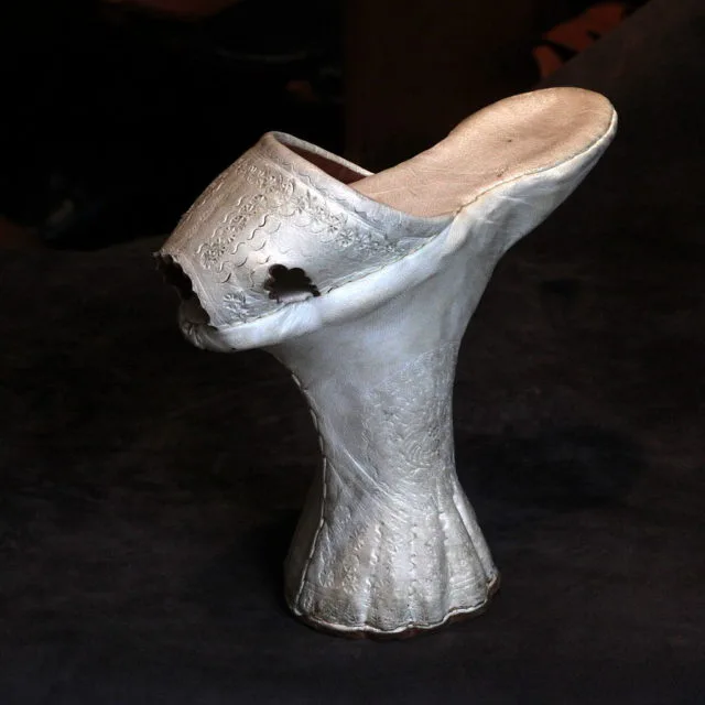 Chopines are platform shoes that were worn by women in the 15th, 16th and 17th century. Made with a very tall wooden platform, these shoes protected the dress from mud and street dust. They became very popular in Venice and were worn by noble women and courtesans.