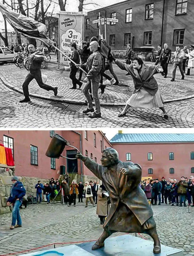 In the quiet town of Växjö, Sweden, a statue captures a split-second of raw courage: a woman mid-swing, her handbag arcing toward a neo-Nazi marcher. This is the memorial to Danuta Danielsson (1947–1988), a Polish-Swedish woman who, on April 13, 1985, became an unlikely icon of resistance when she struck a white supremacist with her purse during a far-right rally. The image of her act, photographed by Hans Runesson and published in Dagens Nyheter, went viral in the pre-internet era, earning the Pulitzer-shortlisted title “Woman with a Handbag.” In 2021, a life-size bronze statue by artist Susanna Arwin was unveiled in Växjö’s Storgatan square, immortalizing not Danielsson’s face or form in repose, but the exact moment of her defiance—purse raised, body lunging forward. Unlike traditional hero statues that pose figures in stoic glory, this one freezes a single, spontaneous act, making it a radical departure in public art and a powerful symbol of everyday resistance against hate.