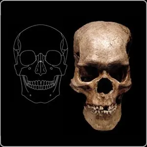 The sculpture is mounted over a drawing to scale to show how large this person was.