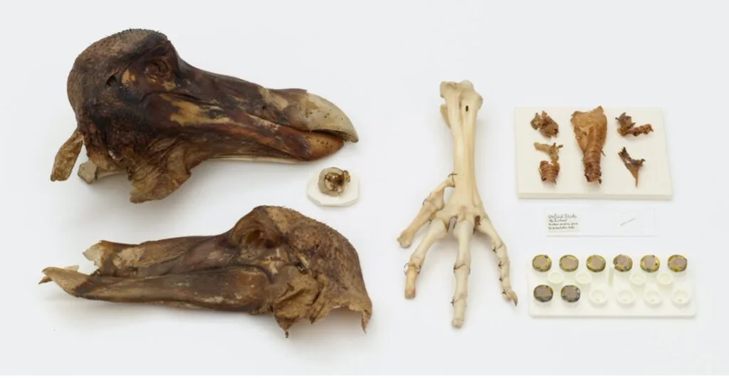 While the answers to those and many other questions about the specimen remain unknown, appetites ultimately sealed the fate of the dodo as a species, which did not survive the seventeenth century. The consumptive urges of empire and natural history often led to the extinction of wildlife. Voyagers released animals like dogs, pigs, and rats onto the dodo’s island. These voracious mammals drove dodos to non-existence by eating their eggs and young. The species became one of the most famous cases of human-induced extinction. Given that the “jerky” on this specimen’s skull constitutes the only extant soft tissue of the fabled dodo, it is a holy grail for researchers today—and the artifact even raises a dream of possible species resurrection to scientists, as it harbors genetic material. But that persistent skin evokes a different, gustatory story, too.