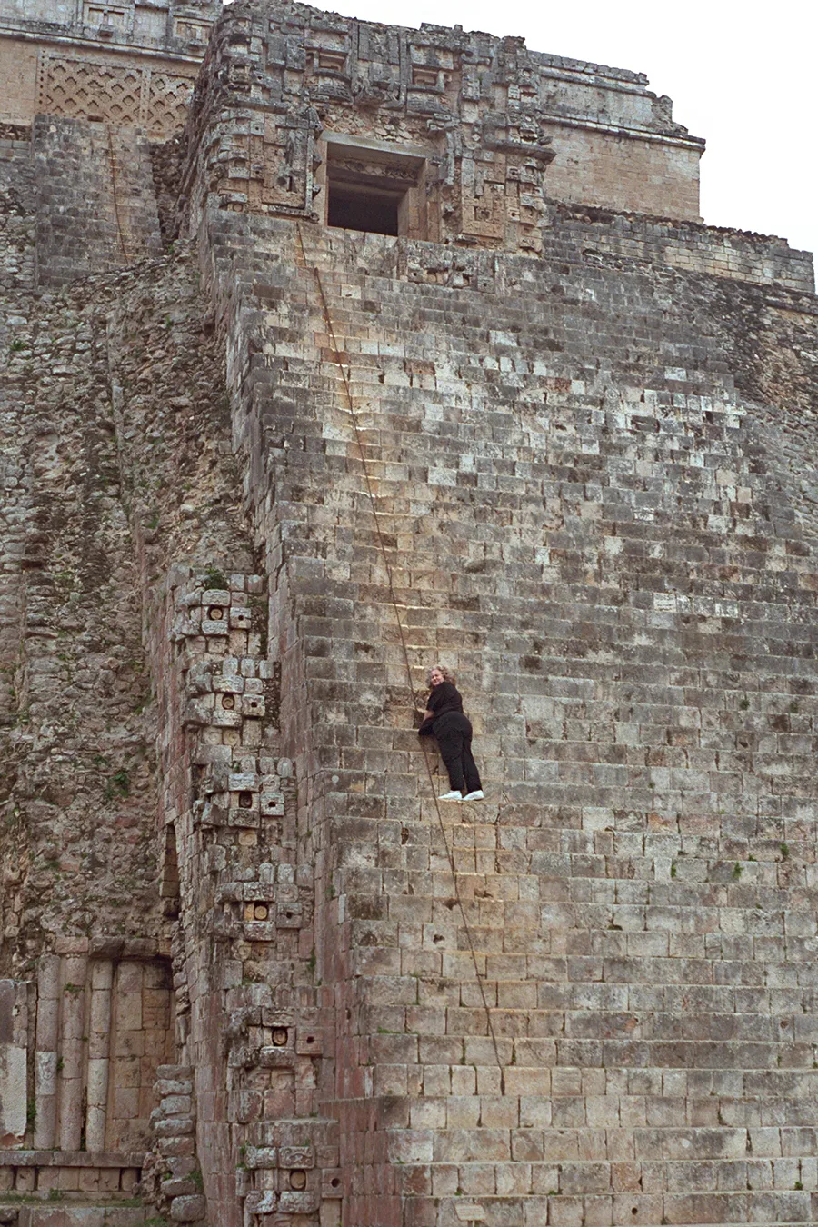 Portions of three of the five temples that comprise the Pyramid of the Magician are visible here. Columns comprising the outer wall of Temple I can be seen at ground level abutting the stair. Temple IV is at the top of the wide stair where two smaller side stairs continue up to Temple V, the final and top-most construction.