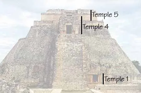 Temple 1 is almost completely covered by later construction. Originally its upper facade had sculptures representing human or deity heads emerging from serpent mouths. The misnamed Queen of Uxmal, which probably depicts a male ruler, is best known. It is now in the National Museum in Mexico city. A copy has been placed in the patio at the entrance to the site.