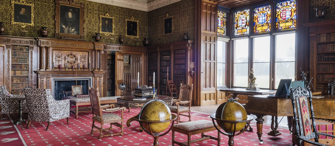 All this would change in the following years. The couple added a grand dining room and library. Thomas Willement, renowned London designer of heraldic glass, made new windows and re-set the Elizabethan windows in the Great Hall. He also designed the sumptuous Dining Room wallpaper, still in remarkably good condition.