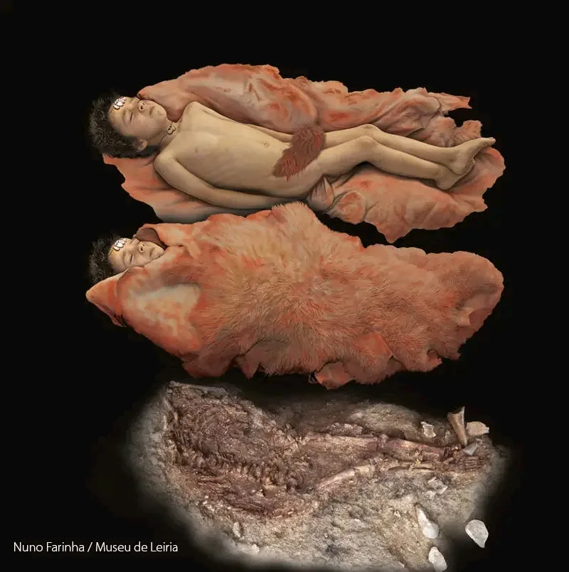 In 1998, archaeologists at the Lagar Velho shelter in the Lapedo Valley in central Portugal made a discovery that changed our understanding of our own prehistory. They found the unique fossil remains of a hybrid boy. Almost the entire skeleton was painted red , and it is believed that he was wrapped in dyed animal skin before burial.