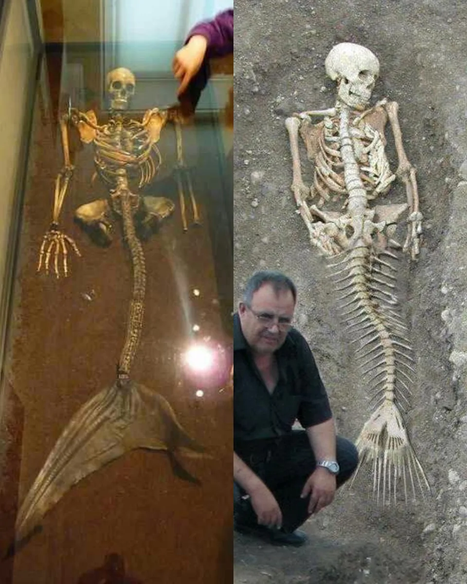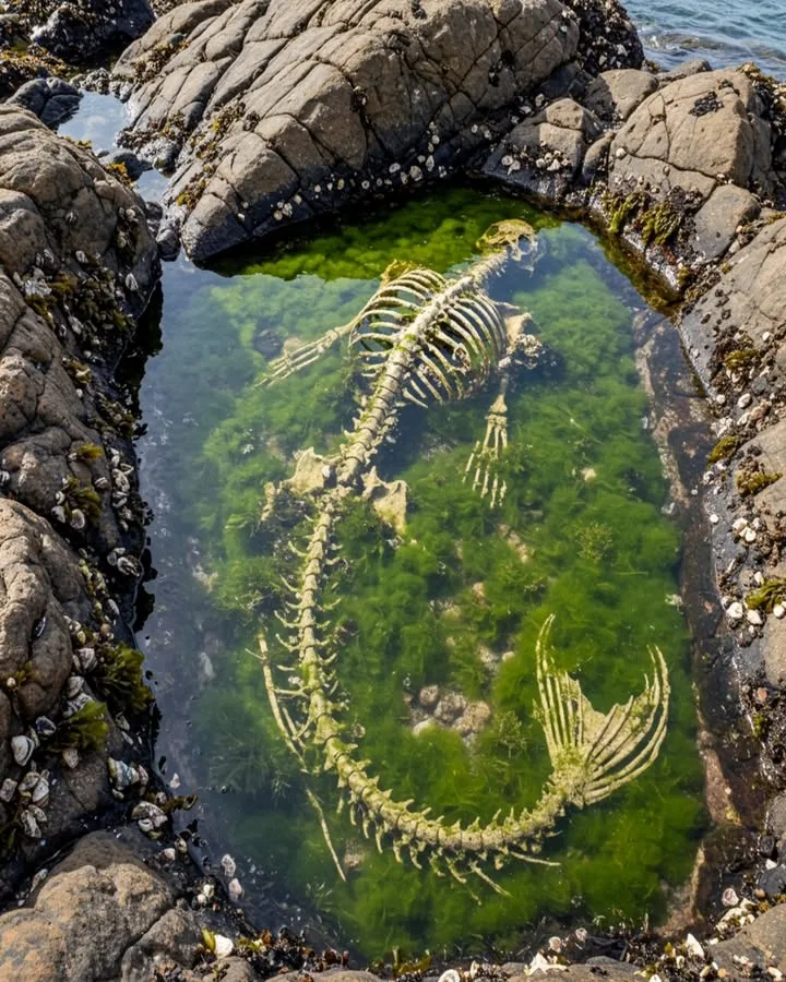 In a remote coastal tide pool, an eerie discovery has reignited one of humanity’s oldest and most haunting legends — the mermaid. Beneath layers of salt and sediment, explorers stumbled upon what appears to be a skeletal form unlike any known creature: part human, part aquatic. Fused ribs curve into fin-like structures, and delicate finger bones stretch into what could only be described as webbing — a biological riddle lost between worlds.
