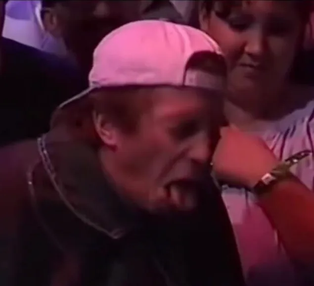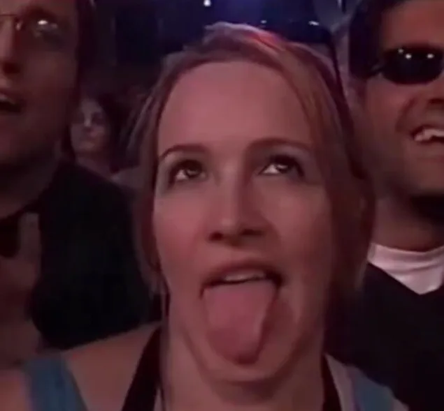 When she does, a crowd erupts into boos and shock. The camera pans to a woman who sticks her tongue out in disgust.