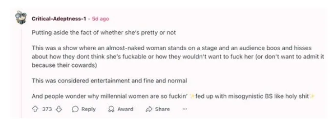 As this person wrote, “Putting aside the fact of whether she’s pretty or not. This was a show where an almost-naked woman stands on a stage and an audience boos and hisses about how they dont think she’s fuckable or how they wouldn’t want to fuck her (or don’t want to admit it because their cowards). This was considered entertainment and fine and normal. And people wonder why millennial women are so fuckin’ ✨fed up with misogynistic BS like holy shit✨.”