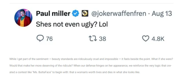 Even in the comments reacting to the clip, I was struck by how many responses still centered the woman’s looks, rather than what was done to her. MANY (if not most) of the top comments were some version of, “She’s not even ugly.”