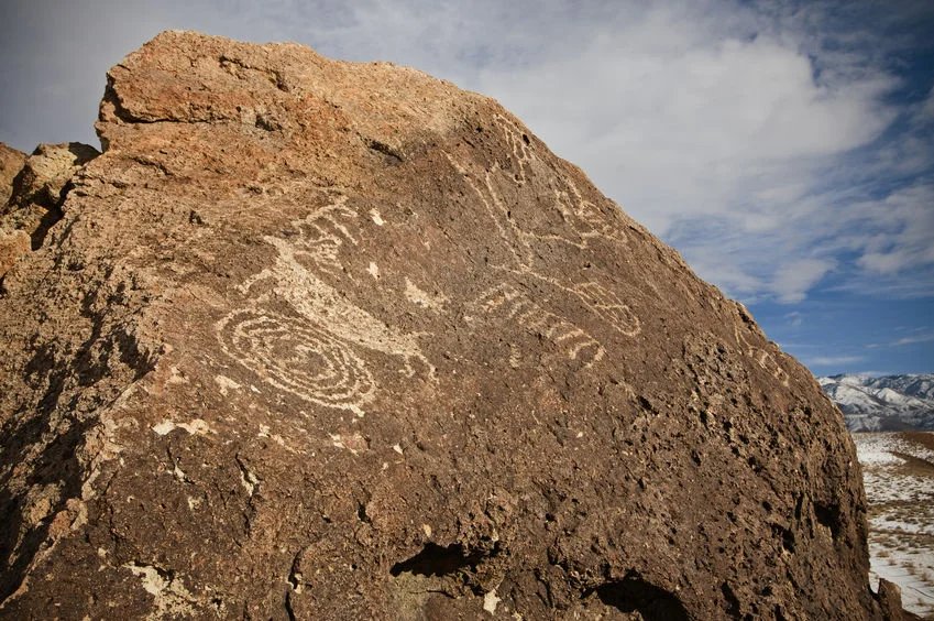 The Paiute-Shoshone Indians chipped away at the dark surfaces of the rock, exposing the lighter tuff underneath, to create the petroglyphs, which can still be seen today.