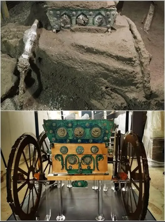 The chariot was found in a double-level portico connected to stables at an ancient villa at Civita Giuliana, north of the walls of the ancient city.