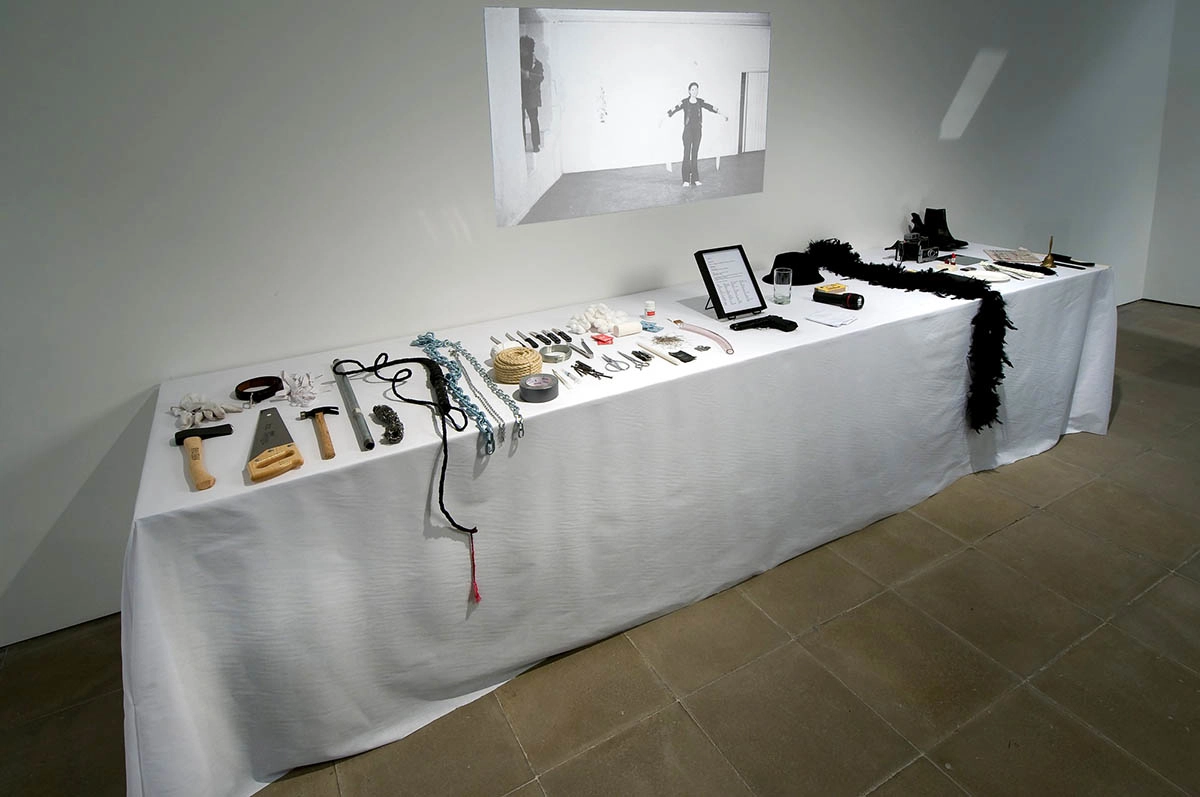“Gun, bullet, blue paint, comb, bell, whip, lipstick, pocket knife, fork, perfume, spoon, cotton, flowers, matches, rose, candle, mirror, drinking glass, polaroid camera, feather, chains, nails, needle, safety pin, hairpin, brush, bandage, red paint, white paint, scissors, pen, book, sheet of white paper, kitchen knife, hammer, saw, piece of wood, ax, stick, bone of lamb, newspaper, bread, wine, honey, salt, sugar, soap, cake, metal spear, box of razor blades, dish, flute, Band Aid, alcohol, medal, coat, shoes, chair, leather strings, yarn, wire, Sulphur, grapes, olive oil, water, hat, metal pipe, rosemary branch, scarf, handkerchief, scalpel, apple.”