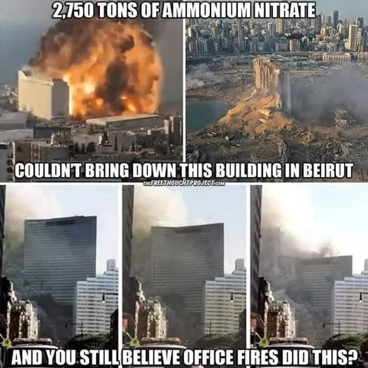 Post-Beirut, theorists claimed the blast’s mushroom cloud and structural damage mirrored 9/11, “proving” controlled demolition with thermite or nano-thermite. They argued the Beirut ammonium nitrate explosion showed how chemicals could mimic plane impacts, dismissing NIST’s findings. Videos comparing the two went viral, ignoring differences: Beirut was a single, ground-level blast; 9/11 involved multi-story fires and structural failure over hours.