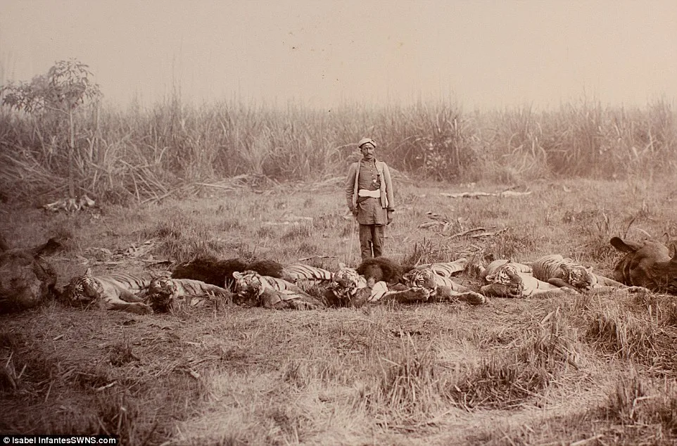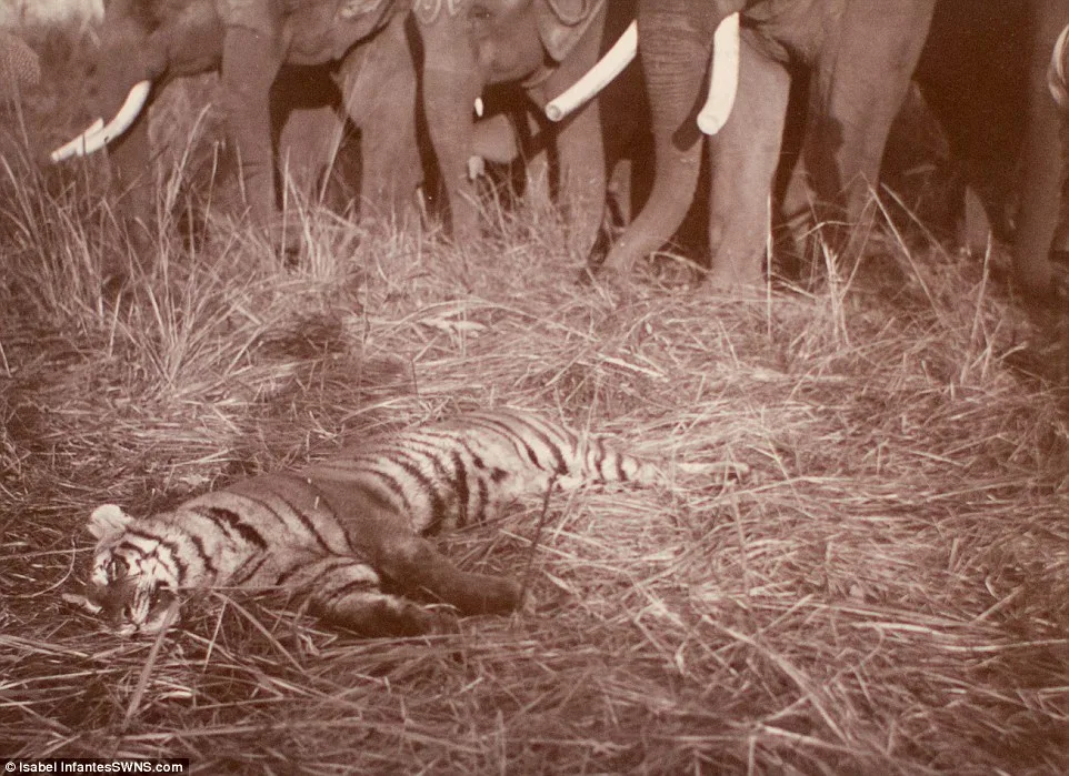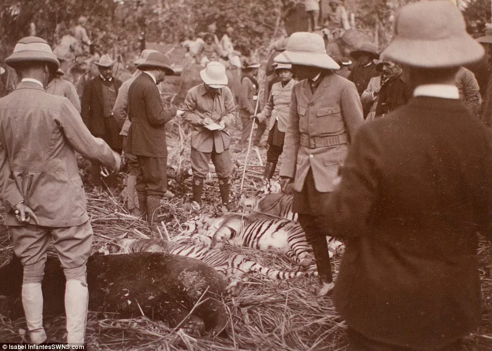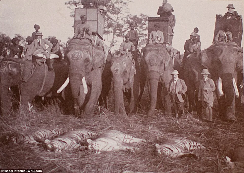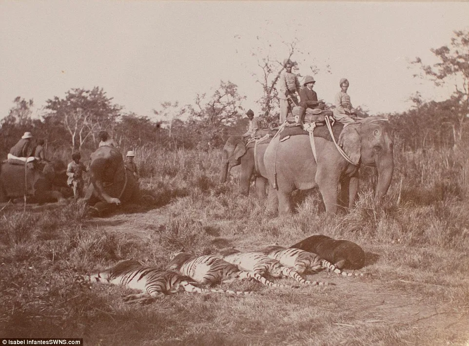 There are numerous photographs showing members of the royal hunting party sat on elephants surrounded by dead tigers on the ground.
