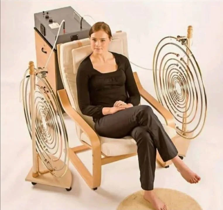 The Concentric Antennas: These are the most distinctive feature. Two sets of beautifully crafted, isolated concentric brass or copper rings are positioned on either side of the patient. Each ring, being a different diameter, has its own inherent resonant frequency.