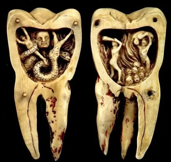 My first tooth extraction was for my top canines, and it was not done with pliers. Though I inherited many dental traits from my ancestors, a fear of dentists was not one of them. My permanent canines got confused on their way down, so instead of pushing out my baby teeth like they were supposed to, they began growing right in front of them. My dad remembers his cousin Thea lie having a similar problem, probably passed down from the British side of our family tree. Dr. Everson had to deal with those two. I was about nine by this time. I think I watched Freaky Friday, or part of it, while breathing in laughing gas to become calm enough for him to give me a shot of Novocain. I didn’t like the idea of not losing my teeth naturally. It felt wrong somehow, like a copout. But those teeth are included in my menagerie anyway.