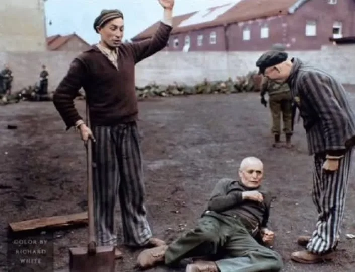 It is one of those images that burns itself into memory the instant you see it. A man in a striped concentration-camp uniform stands over another man on the ground. He is holding a shovel high above his head, the blade catching the pale afternoon light. The man on the ground, an SS guard stripped of his jacket and belt, looks up with the blank expression of someone who already knows the blow is coming. A second former prisoner points angrily at the guard, as if testifying: this one, this one especially.
