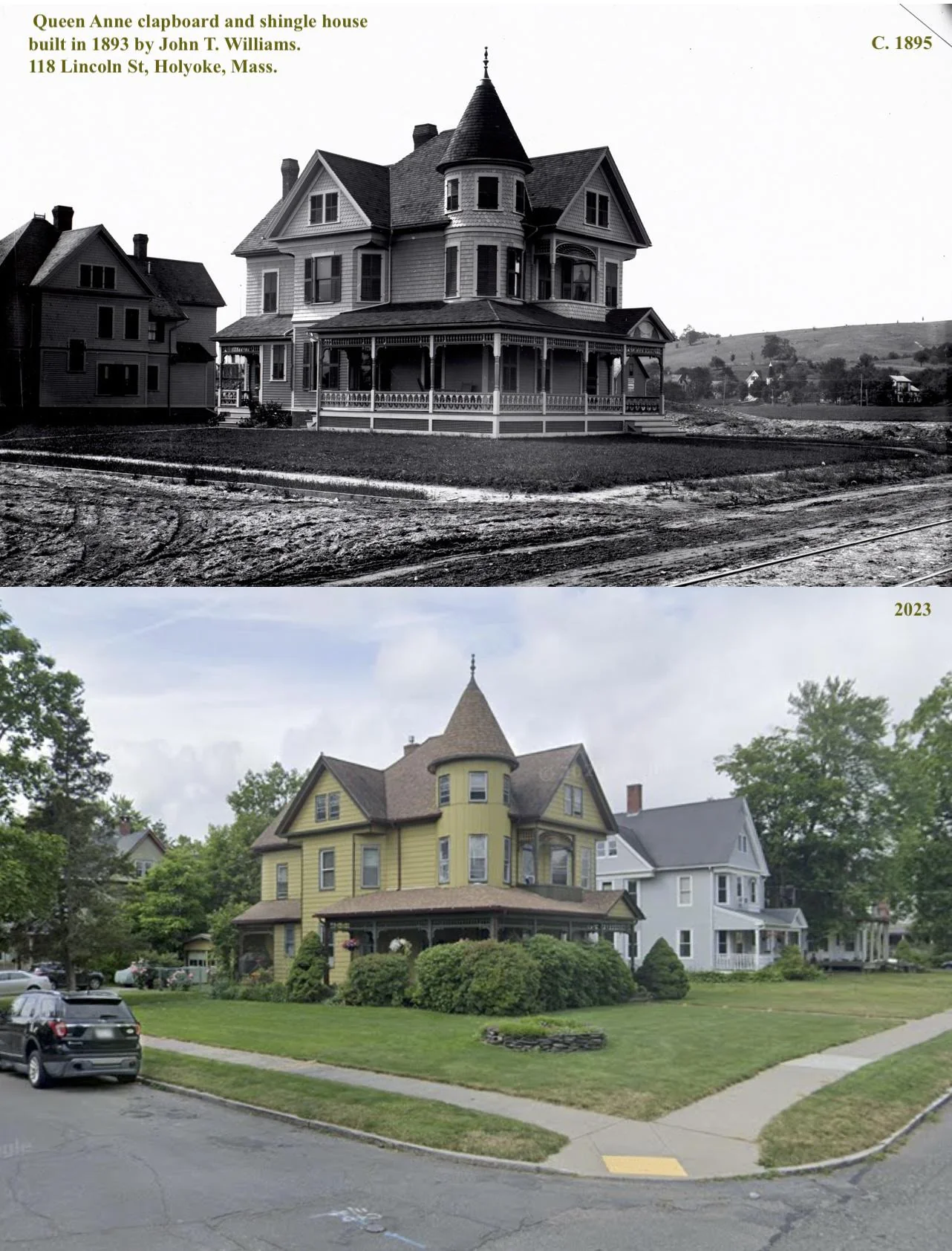 Built in 1893 by John T. Williams, the house at 118 Lincoln Street exemplifies Queen Anne Victorian architecture, popular in the late 19th century for its eclectic mix of asymmetrical designs, textured surfaces (clapboard and shingles), and decorative elements like bay windows and gingerbread trim. Williams, likely a prosperous resident during Holyoke’s industrial heyday, constructed it in what was then a burgeoning neighborhood for the city’s middle and upper classes.