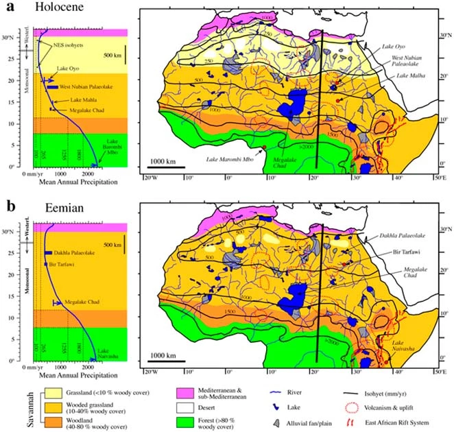 The pattern of turning into a green Sahara from the deserted area of North Africa exists because of a slight wobble in orbit and the earth’s axial rotation. The wobble places the Northern Hemisphere closer to the sun in summer every 23000 years. This accelerated the West African Monsoon and brought rainfall as well as greenery to the area.
