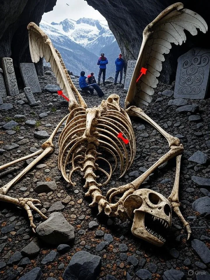 In the rugged Pyrenees Mountains near Lourdes, France, a skeleton with falcon-like wing structures was reportedly uncovered in a limestone cave close to the Grotte de Massabielle, a site of pilgrimage. Featuring a humanoid frame with feather-like bone extensions, this relic, preserved by the cave’s dry cold, sparks intrigue: Was it a revered sky spirit tied to Celtic myths? Why buried in this sacred 2,200-meter-high cave? Why the silence from authorities? This find, amid the Pyrenees’ 430 bird species, challenges anthropology, hinting at a lost hybrid erased from Occitan lore. Yet, hoaxes like the 2015 “Merrylin” winged skeletons and misidentified eagle fossils urge caution. Could it be a mythic relic, a misidentified falcon fossil, or a fabricated tale? Lourdes’ winds demand answers, but the truth likely lies in legend and fabrication rather than fossilized fact.