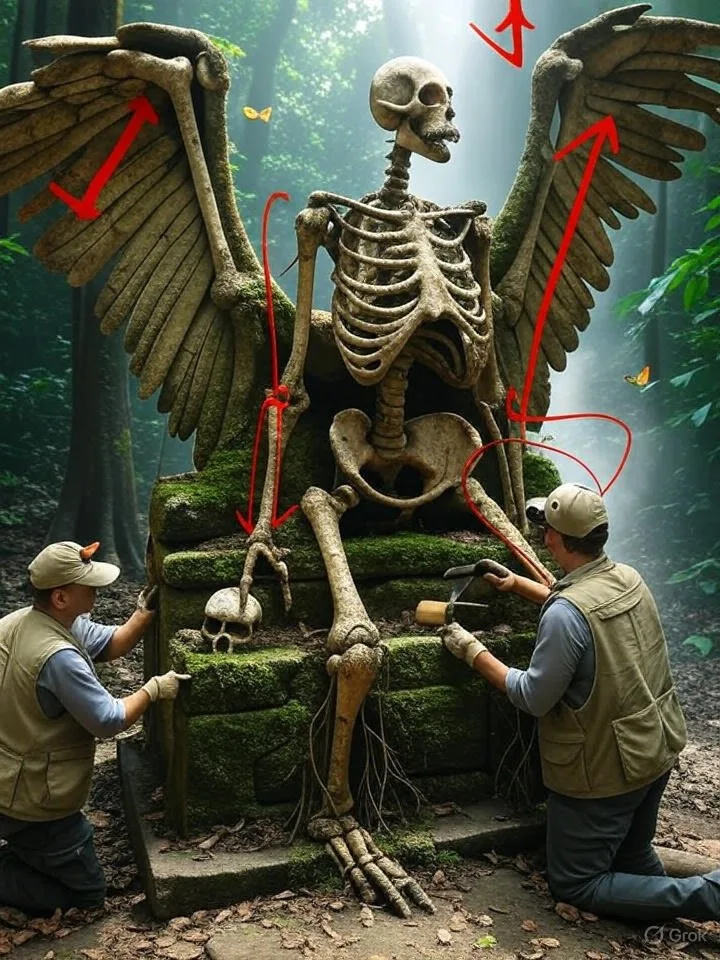 Amid the vine-choked ruins of Cambodia’s Angkor Wat near Siem Reap, archaeologists have reportedly exhumed a bewildering skeleton with eagle-like wing structures, concealed in an underground chamber of a subsidiary temple that echoes Khmer divine legends. Exhibiting broad wings fused to a humanoid frame preserved in eerie detail beneath layers of laterite and sandstone, this cryptic relic—discovered at a site where bas-reliefs depict celestial beings—unleashes a storm of spine-tingling riddles: How did this winged entity soar through pre-Angkorian skies? What ritual sealed its fate in such exalted seclusion? And why the lofty blackout from cultural custodians? This summit-storming revelation shreds the tapestry of Khmer anthropology, conjuring visions of an era where bird-human hybrids patrolled the heavens, expunged from imperial inscriptions. Could it attest to mythic sky-dwellers, veiled shamanic experimentation, or a relic ordained for perpetual shadow? As jungle echoes ascend, the world wings toward truth: ethereal evasion or the pinnacle of Angkor intrigue? Yet, exhaustive research reveals no verified discovery; this tale is a modern fabrication weaving Angkor’s real archaeological splendor with fictional hoaxes, urging discernment in an era of viral myths.